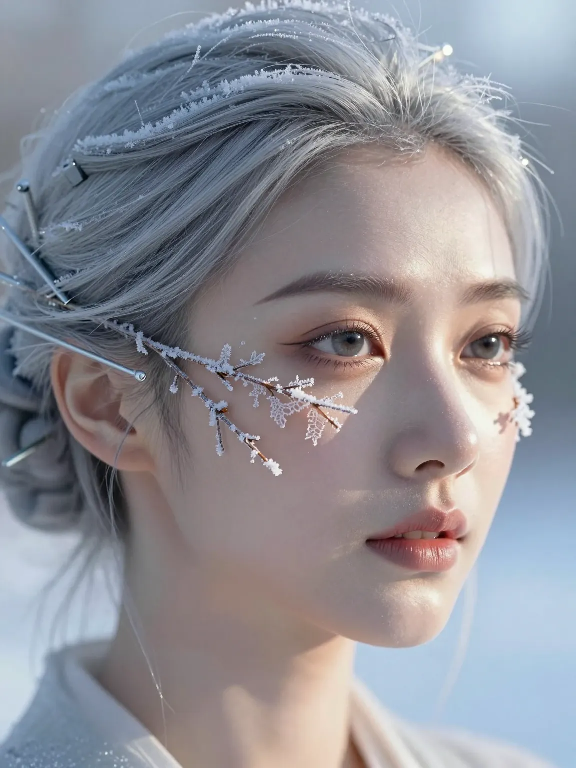Lighting: soft key light from the front-left with gentle rim light on the jawline, sculpted shadows, realistic skin texture. Mood & color: cool-toned high-end gray atmosphere, understated luxury.