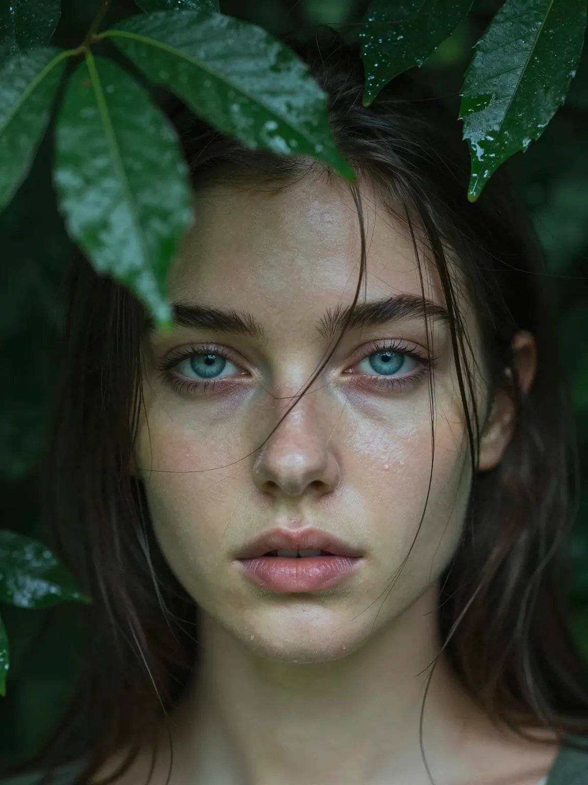 the greens are deep and cool with subtle moisture sheen on the leaves. Razor-sharp focus on the eyes, natural skin texture and pores visible, shallow depth of field melting the background into dark emerald bokeh, 85mm portrait lens look, 8K, 3:4 vertical framing.