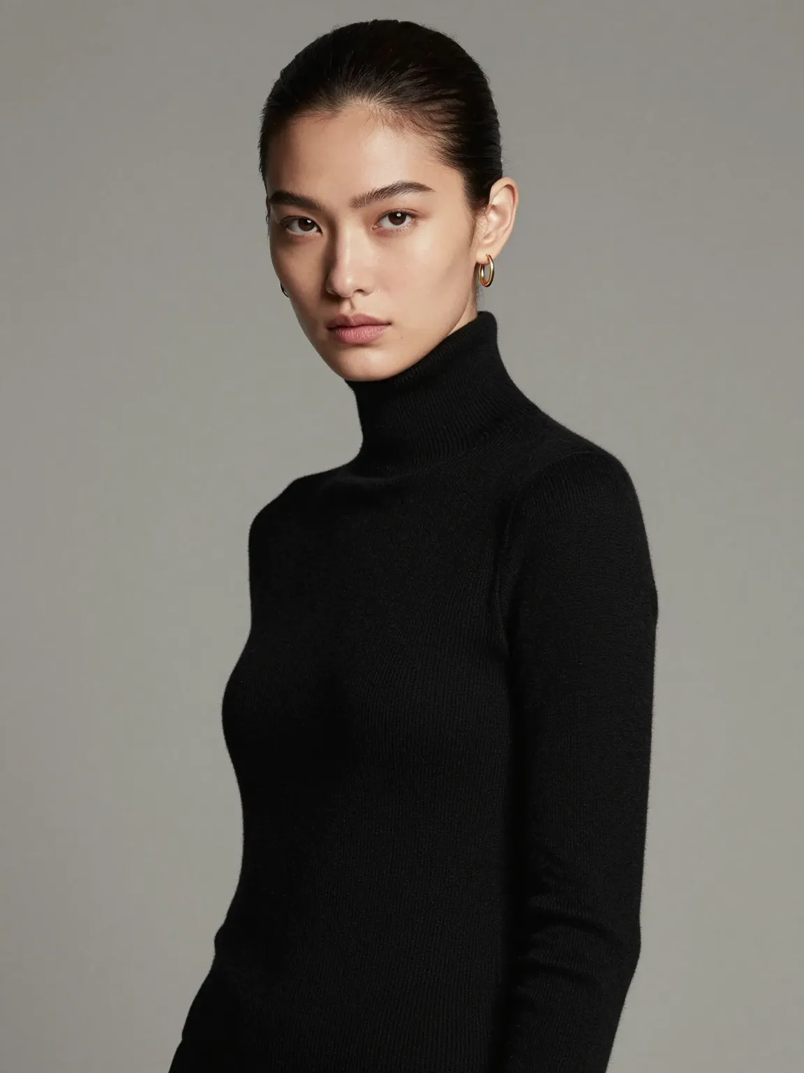 Outfit: black ribbed turtleneck knit sweater, tailored fit, matte texture. Accessories: minimalist small gold hoop earrings, no other jewelry.