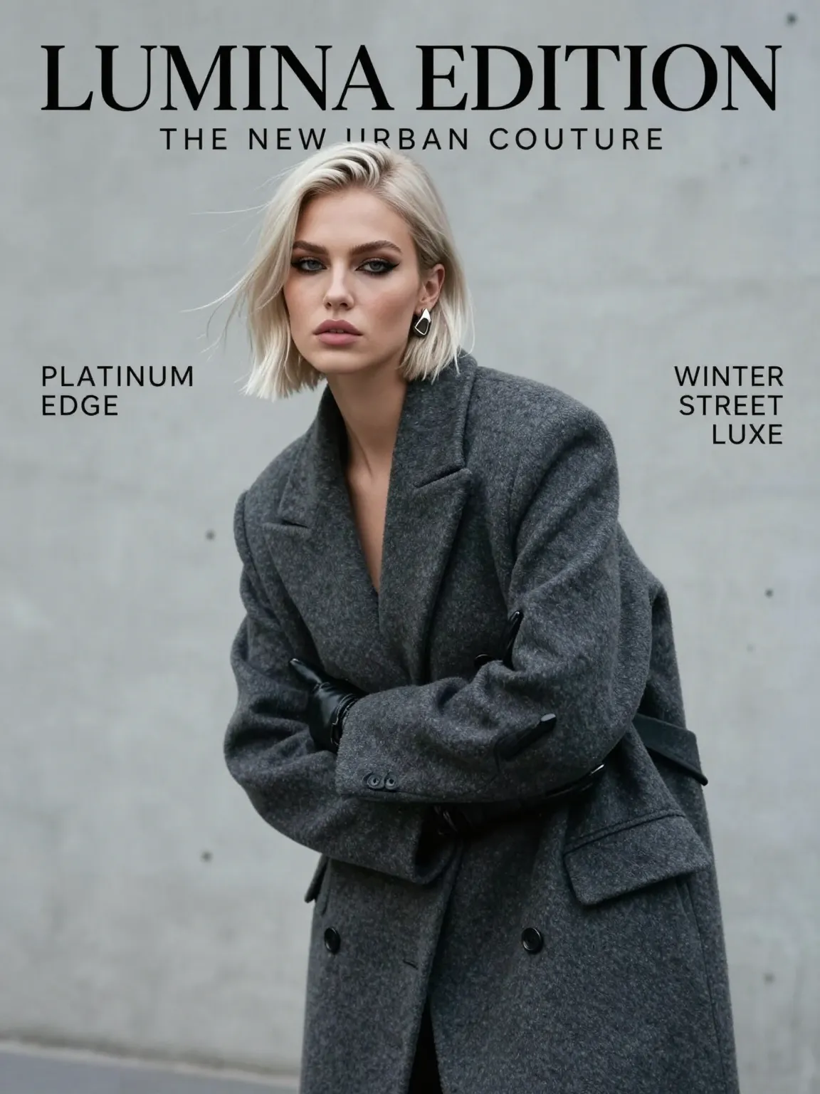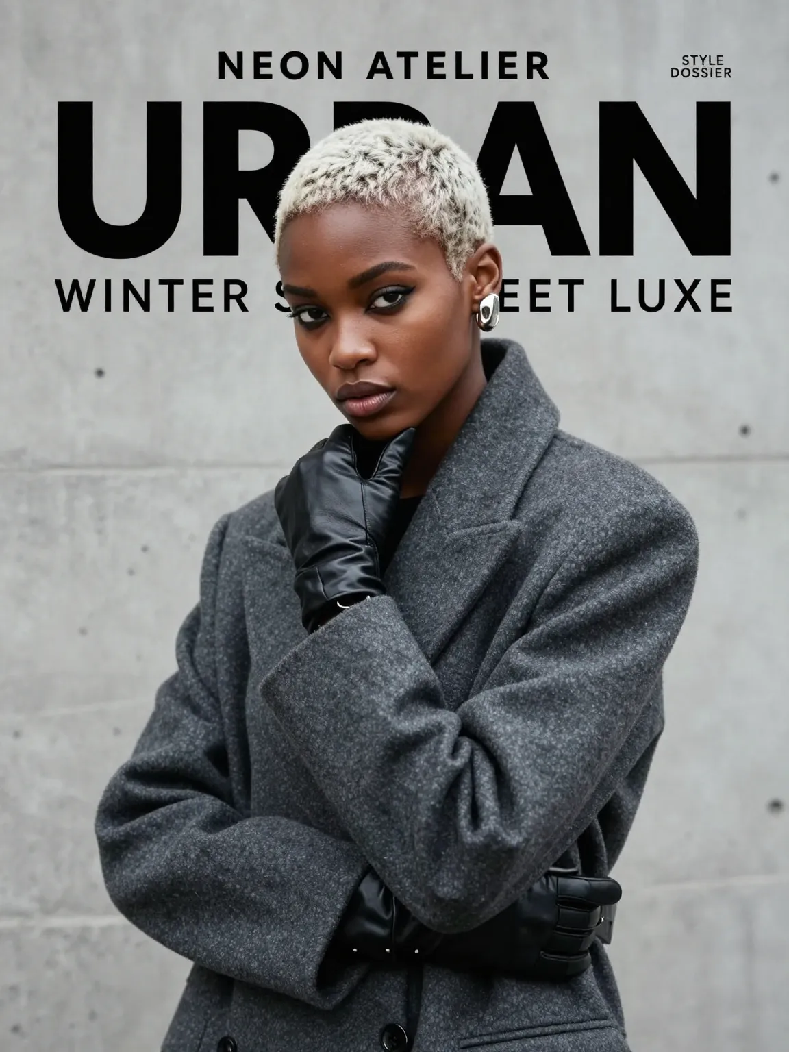 Outfit: structured charcoal wool coat with exaggerated shoulders, black leather gloves, high-fashion street couture.