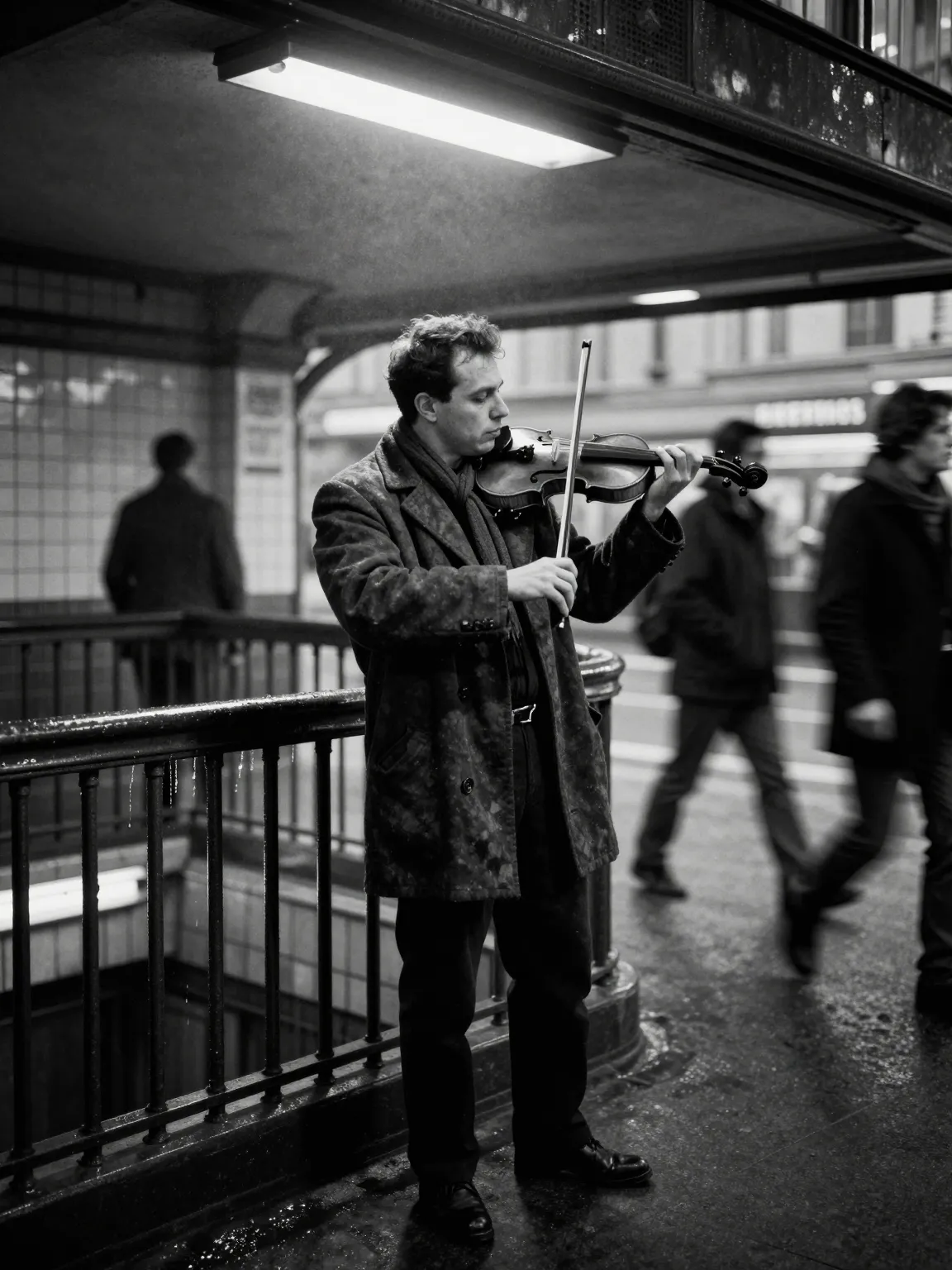 A street violinist in a worn overcoat and scarf, playing beneath a tiled metro entrance; commuters blur past like phantoms, water drips from iron railings, a harsh station light etches his bow arm while the rest dissolves into soot-black shadows.
