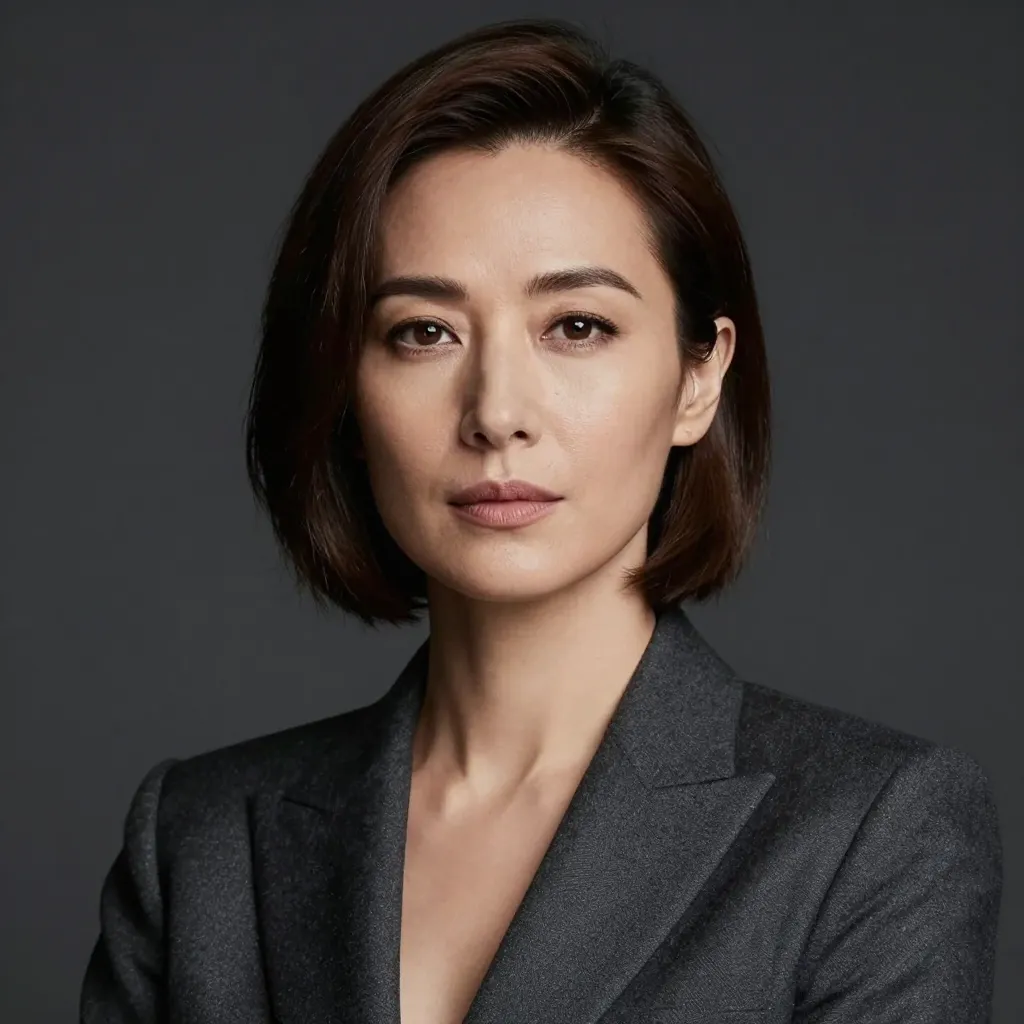 High-end executive headshot, 42-year-old French woman, porcelain skin, short brunette bob, subtle eyeliner, composed authoritative gaze, tailored charcoal suit, dark studio background, soft key light + subtle rim light, realistic pores, sharp eyes, 105mm portrait look, elegant neutral grading.