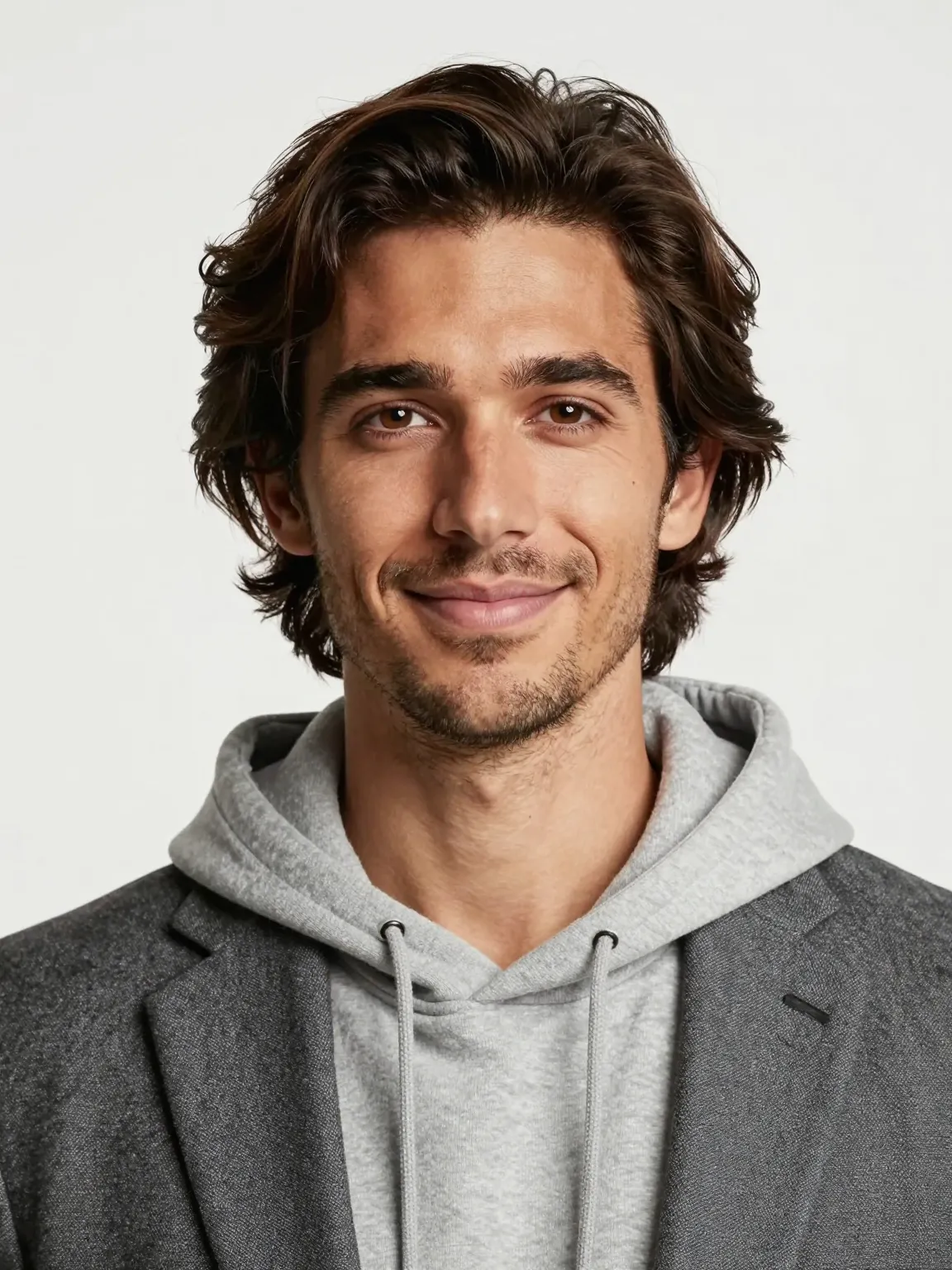 Modern tech founder portrait, 29-year-old American man, light tan skin, medium-length wavy hair, light stubble, friendly confident expression, hoodie under blazer, minimal bright studio background, clean lighting with soft shadows, realistic hair strands, sharp eyes, 85mm lens look, contemporary grading, ultra realistic.