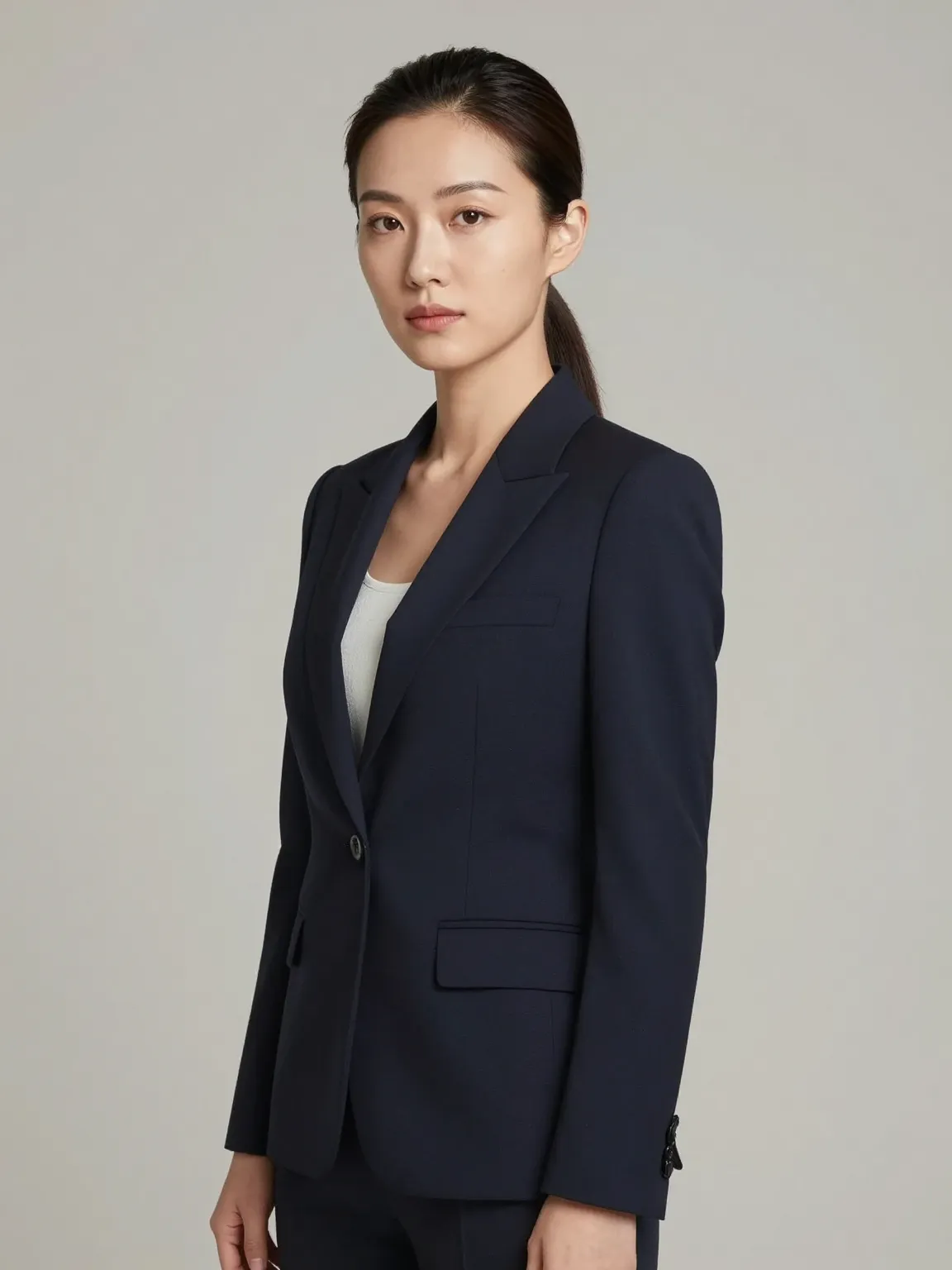 Executive studio portrait, 37-year-old woman, fair skin, slick ponytail, confident serious expression, structured navy power suit, neutral seamless background, clean soft key light, subtle rim light, sharp eyes, realistic skin texture, 85mm lens look, premium corporate finish.