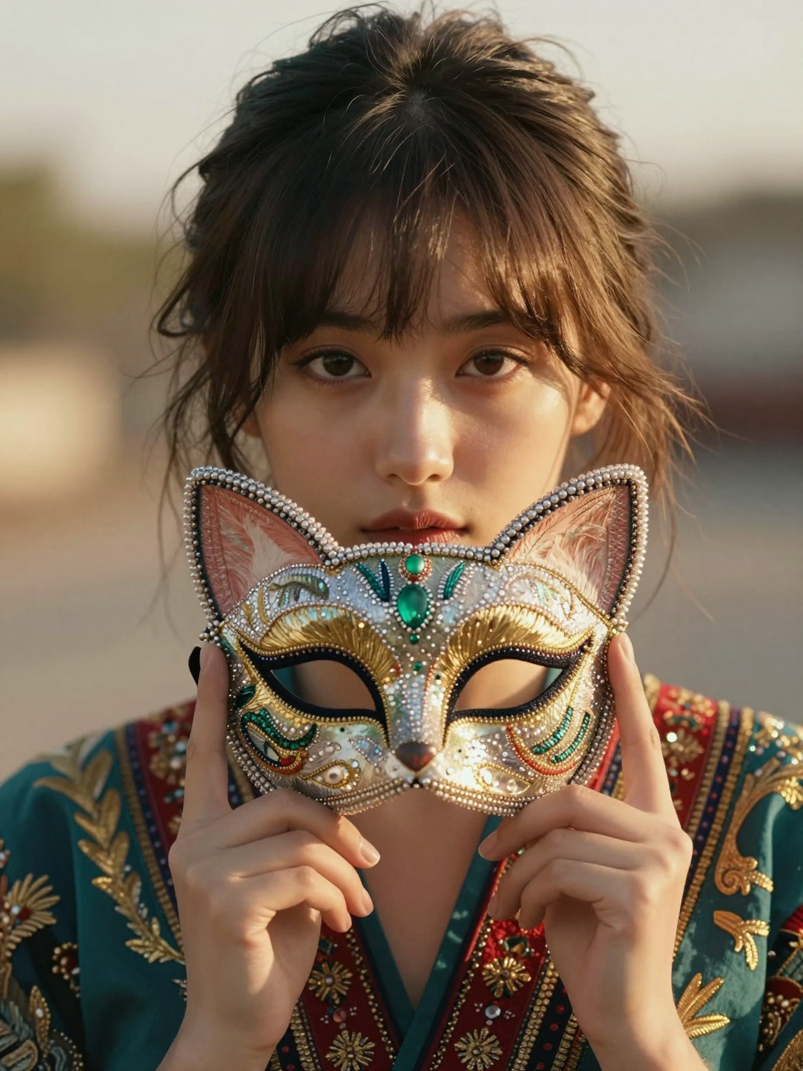 Golden hour light creates soft highlights on hair and mask, gentle shadow falloff, creamy background blur, filmic contrast, realistic skin texture, sharp eyes, subtle grain.