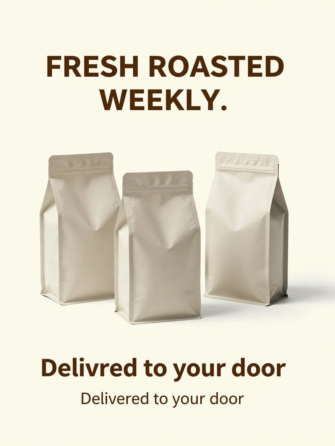 Clean DTC coffee subscription ad featuring three matte stand-up coffee bags (generic, unbranded).