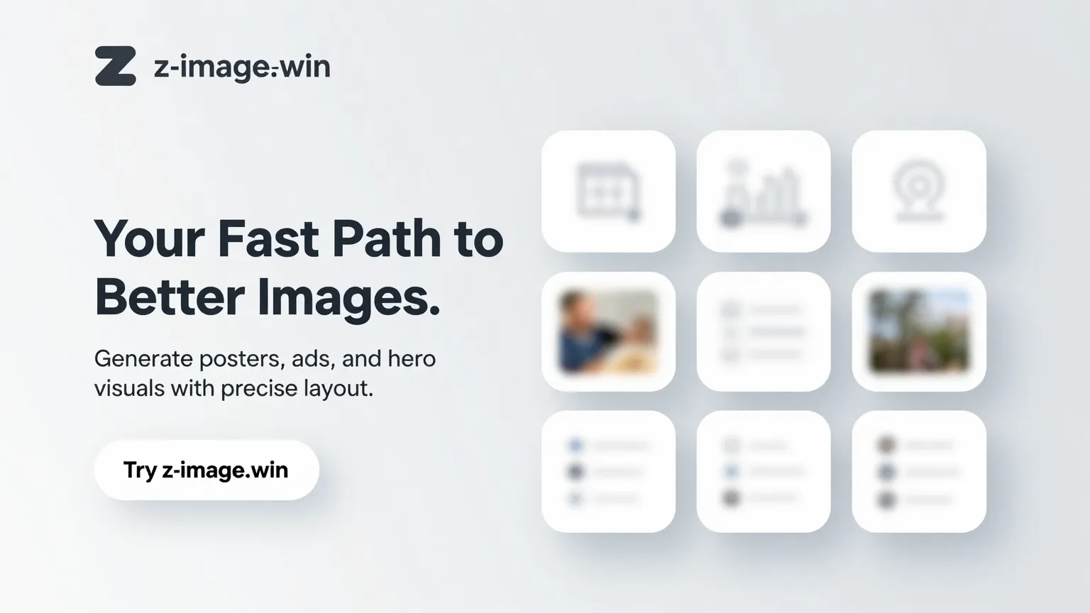 No watermarks, no extra logos or branding except the specified top-left logo. No extra on-image text beyond headline/subheadline/CTA. Ensure CTA text exactly "Try z-image.win". Maintain readable font sizes for mobile crop.- aspectRatio: 16:9