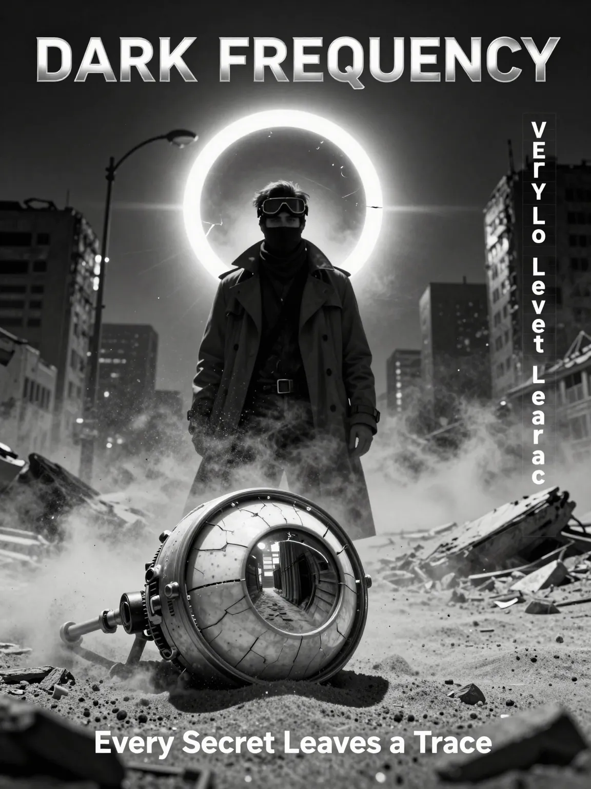 Vertical sci-fi noir poster centered on a lone trench-coat investigator — goggles on forehead, scarf over mouth, face partly in shadow; foreground features a cracked mechanical eye (robotic optic sphere) with a reflective lens.